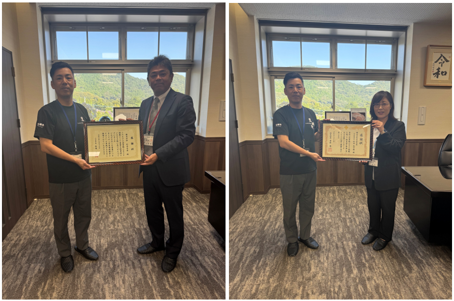 杉本本店では、当社が所有する最大規模の牧場「矢岳牧場」が所在する熊本県人吉市および相良村に対し、毎年企業版ふるさと納税を通じて寄附を行っております。このたび、令和7年度の寄附に対する感謝状の贈呈式が、弊社本社にて執り行われました。